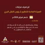 صرف مرتبات الهيئة العامة لتنظيم شؤون النقل البري لشهر فبراير 2026 أعلنت الهيئة العامة لتنظيم شؤون النقل البري عن صرف مرتبات موظفيها لشهر فبراير 2026م. وأوضحت الهيئة أ...