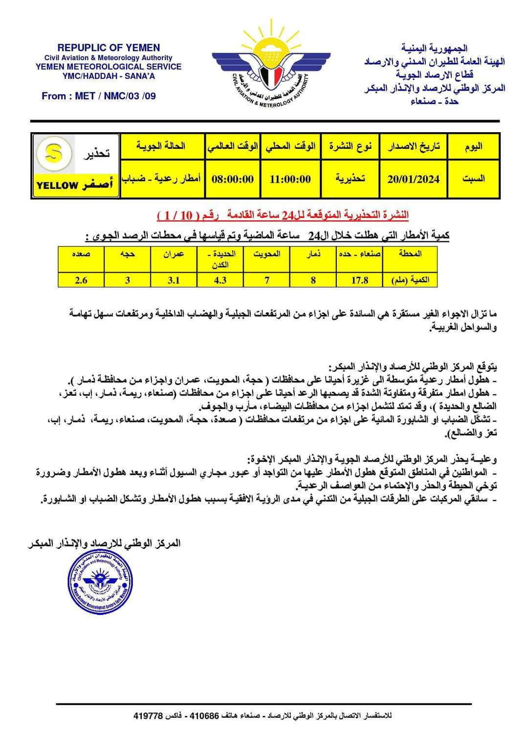 النشرة التحذيرية المتوقعة لل24 ساعة القادمة رقم( 10 / 1 )
