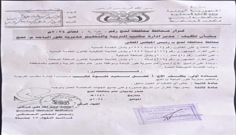 ونص قرار محافظ لحج الجديد على تكليف الاستاذ فضل سعيد علوه غالب مديرا لإدارة التربية والتعليم بمديرية طور الباحة، على أن يلغى اي تعيين أو تكليف سابق .ويعمل بالقرار من تاريخ صدوره