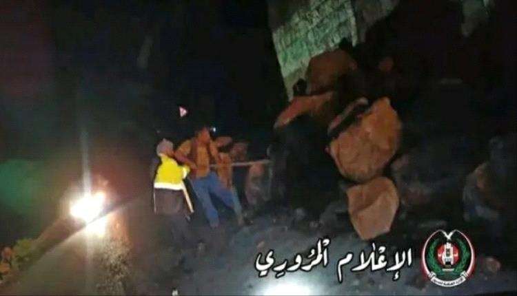 ونوهت الشرطة في بيان عبر مركز الإعلام المروري بـ"فيسبوك"، إلى أن فرق الإنقاذ تعمل حالياً على تنظيم حركة السير والمساعدة في إزالة الصخور وإعادة الحركة المرورية الى طبيعتها.