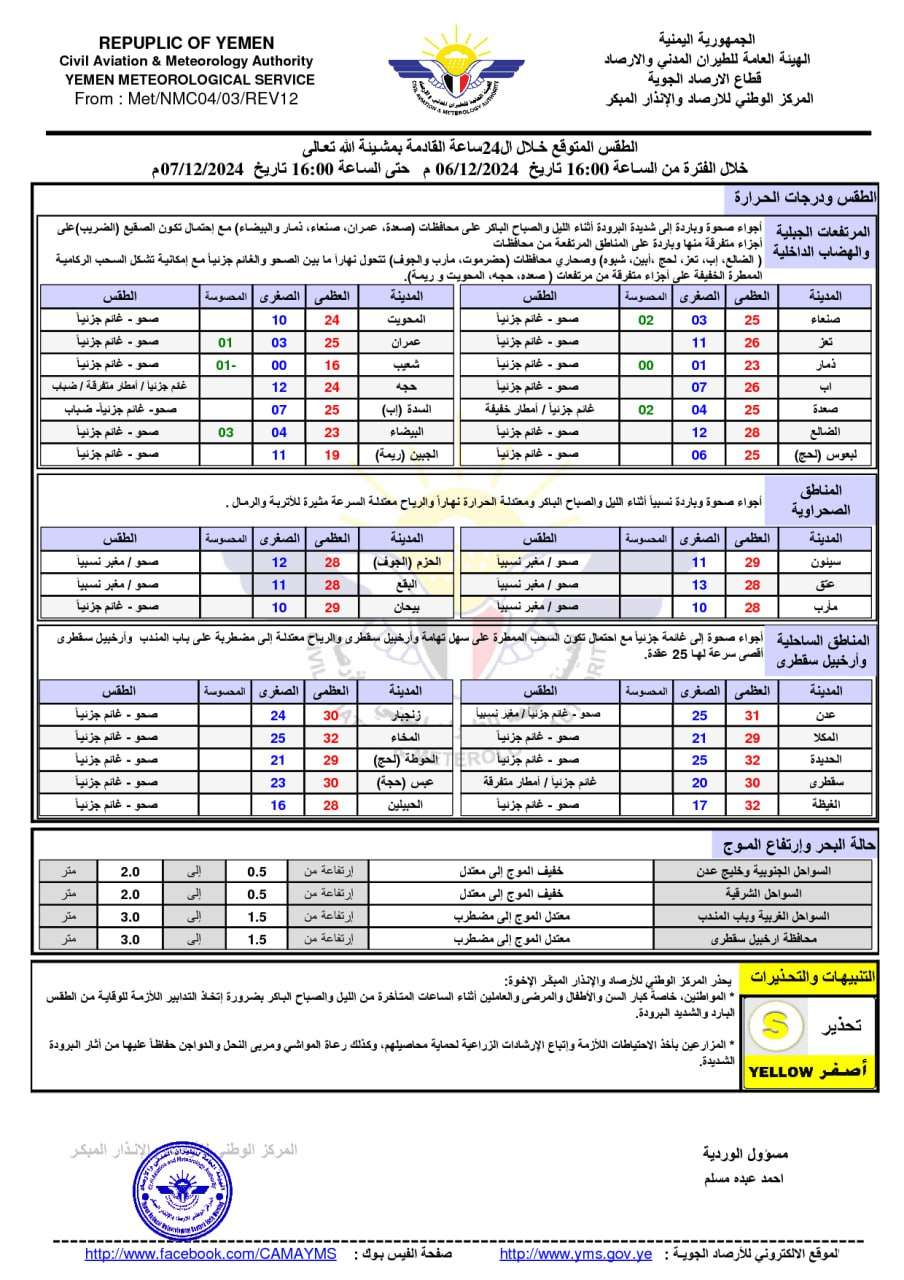 أصدرت الهيئة العامة للطيران المدني والأرصاد – قطاع الأرصاد الجوية – المركز الوطني للأرصاد تقريرًا عن حالة الطقس المتوقعة خلال الـ24 ساعة القادمة في اليمن.