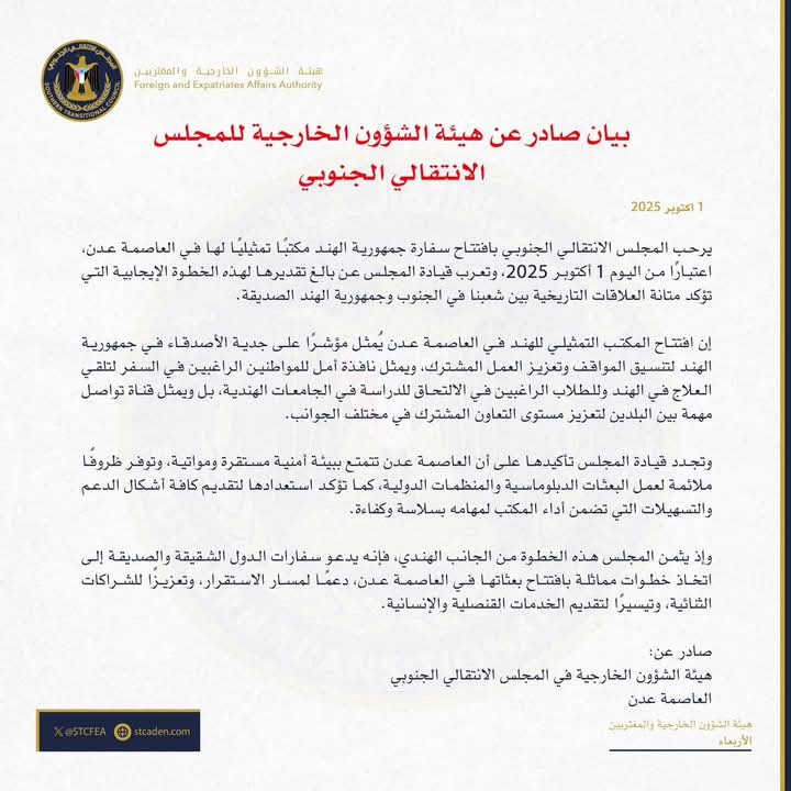 واكد المجلس الانتقالي ان افتتاح المكتب التمثيلي للهند في العاصمة عدن يُمثّل مؤشراً على جدّية الأصدقاء في جمهورية الهند تجاه مواصلة وتطوير العمل الدبلوماسي