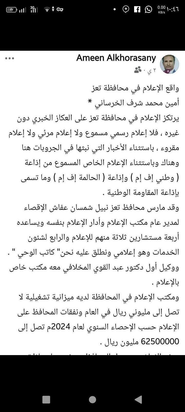 كشفت مصادر مطلعة، الليلة، أن سبب إقالة مدير عام مكتب الإعلام بمحافظة تعز السابق يعود إلى منشور نشره قبل أيام، قال فيه "لا لفساد المحافظ"، في إشارة إلى اعتراضه على تخصيص أكثر من 62 مليون ريال كميزانية سنوية للإعلام، بينما لا يستلم المكتب فعلياً سوى مليوني ريال فقط.