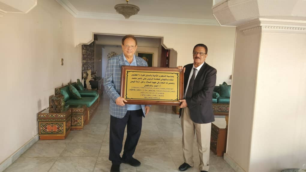 وفي نهاية الاحتفالية، قدم المستشار أحمد سالم فضل العويني لوحة تذكارية بخط المسند للرئيس بمناسبة ذكرى الثورة 14 أكتوبر.