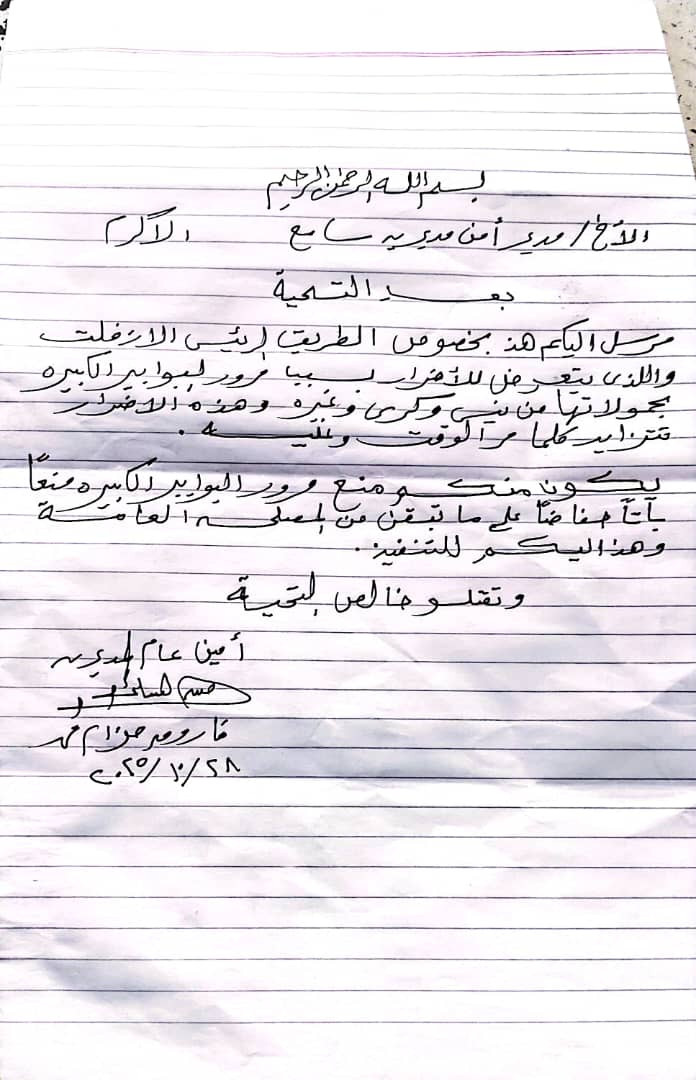 واطلق هنا مناشدة للسلطة المحلية في المديرية والجهات الامنية سرعة ضبط القائمين على مثل هذه الاعمال التي تعرض الطريق الاسفلتي للتخريب ومنع الناقلات الكبيرة من الدخول الى السائلة عبر هذا الطريق .