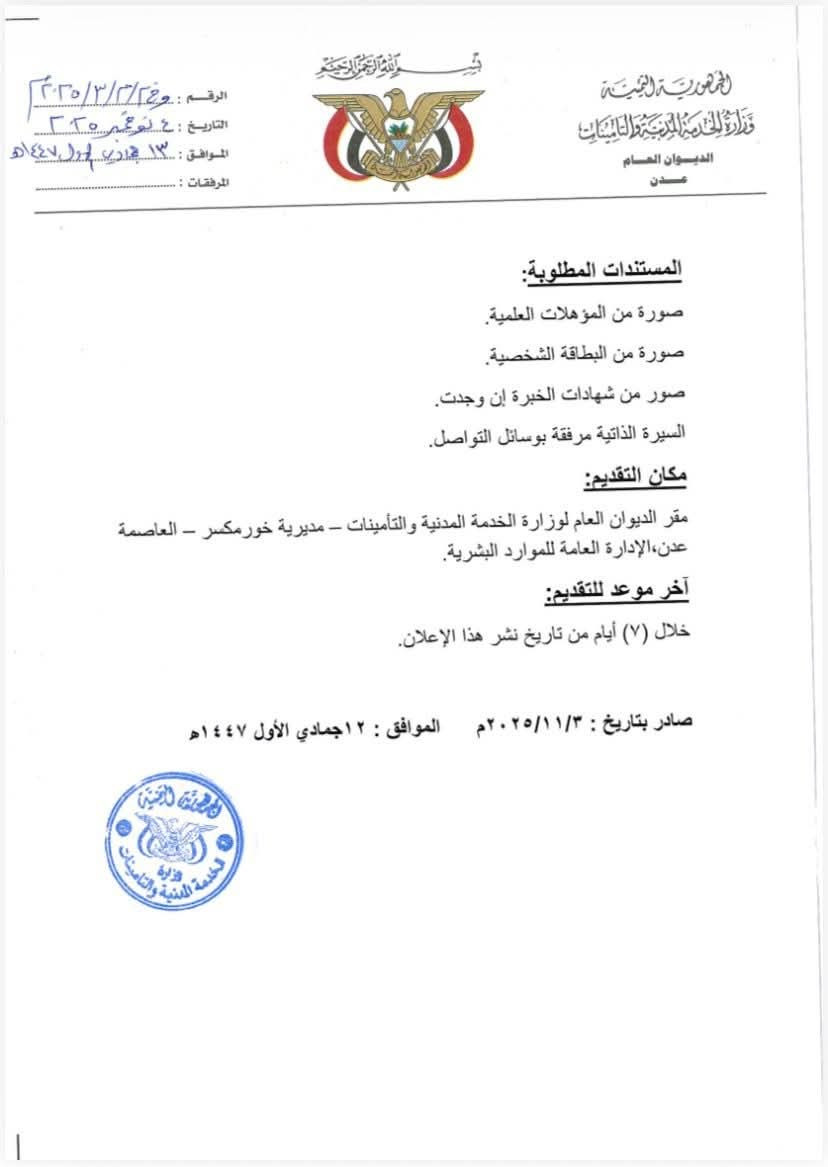 أعلنت وزارة الخدمة المدنية والتأمينات عن توفر فرصتين وظيفيتين فنيتين في الديوان العام بالعاصمة عدن، وذلك ضمن جهودها لتعزيز الكفاءة الفنية في مرافقها الحيوية.