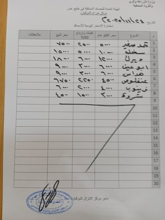أعلنت الهيئة العامة للمصائد السمكية في العاصمة عدن، أسعار الأسماك الاثنين ٢٤ نوفمبر ٢٠٢٥م ، عن استقرار نسبي في أسعار الأسماك، مع تسجيل تفاوت بسيط في بعض الأصناف نتيجة تباين كميات العرض والطلب في الأسواق المحلية.