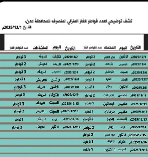 وبحسب التوضيح، يبلغ عدد المحطات المركزية 13 محطة موزعة على مديريات عدن، جرى تزويدها منذ تاريخ 1 ديسمبر 2025م بعدد إجمالي بلغ 46 قاطرة غاز، توزعت على النحو التالي: