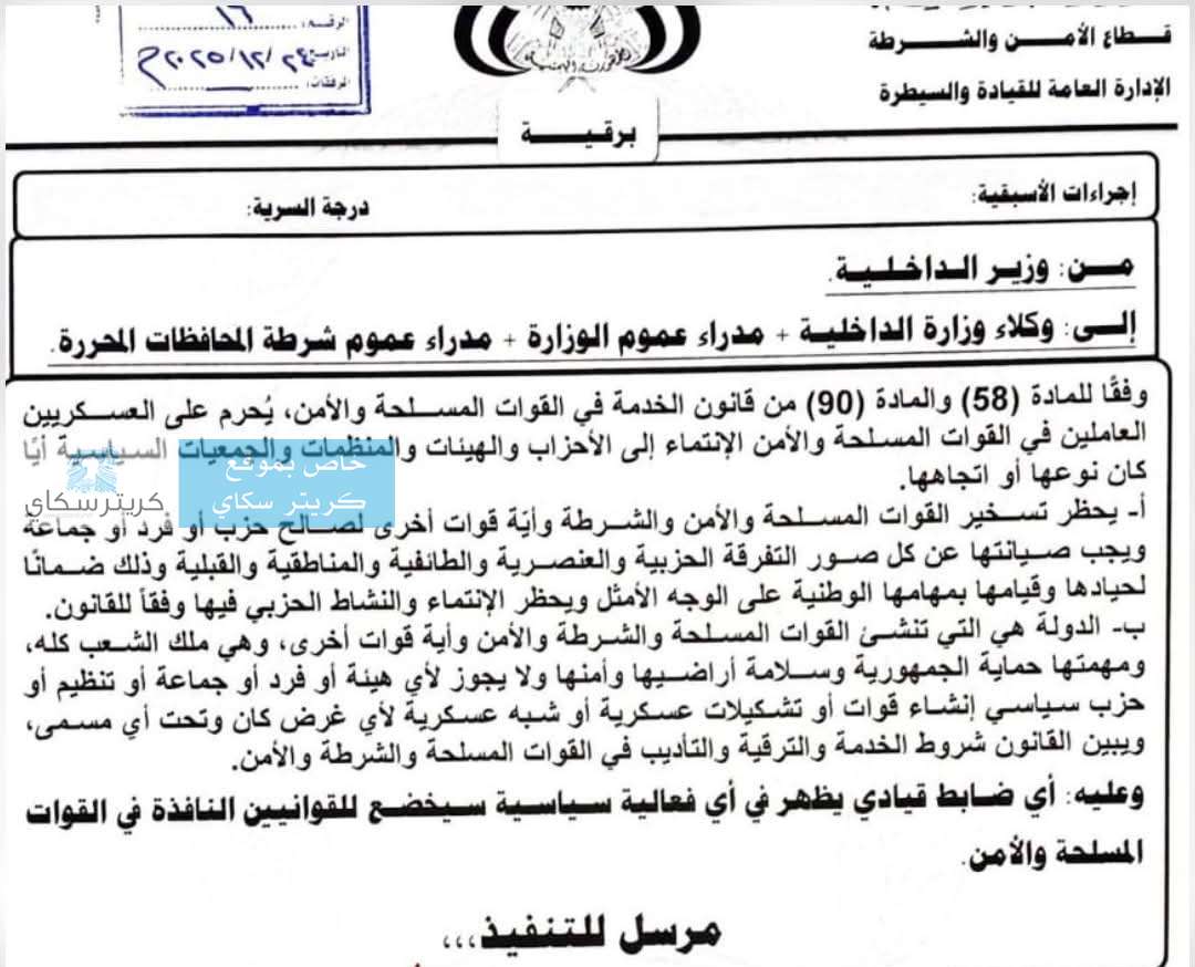 وزير الداخلية اليمني اللواء الركن إبراهيم حيدان يوجّه تعميماً لقيادة الوزارة ومسؤوليها ومدراء شرطة المحافظات بحظر المشاركة في أي أنشطة أو فعاليات سياسية مؤكداً أن أي ضابط قيادي يظهر في فعالية سياسية سيخضع للمساءلة وفقاً لقوانين الخدمة في القوات المسلحة والأمن