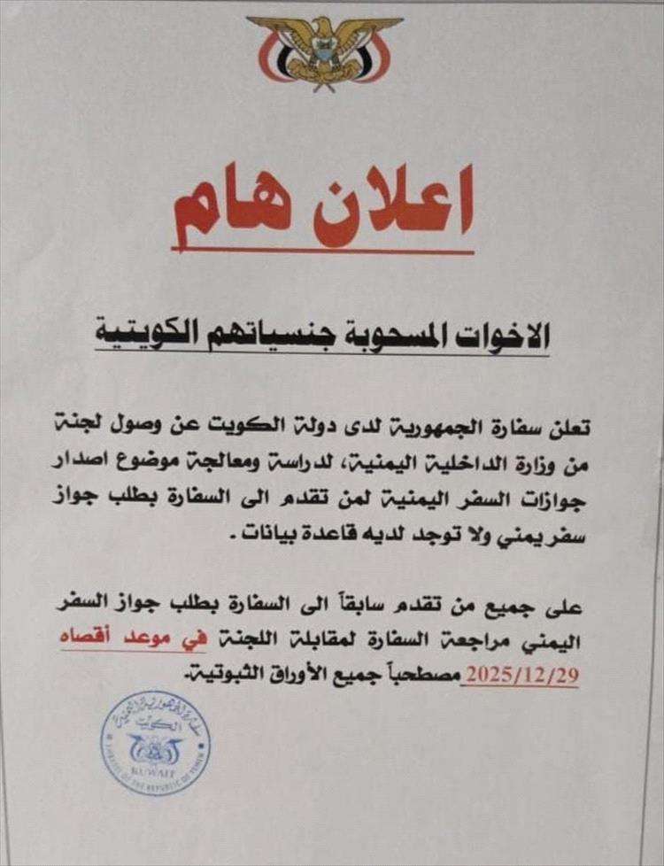 أعلنت سفارة الجمهورية اليمنية لدى دولة الكويت عن وصول لجنة من وزارة الداخلية اليمنية، مختصة بدراسة ومعالجة طلبات إصدار جوازات السفر لليمنيين الذين لا توجد لهم بيانات سابقة، وبينهم من كانوا قد حصلوا على الجنسية الكويتية قبل عقود، قبل أن تُسحب منهم مؤخرًا ضمن قرارات شملت آلاف الحالات.
