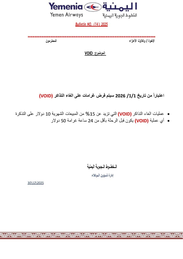 أصدرت شركة الخطوط الجوية اليمنية، مساء اليوم، قرارًا جديدًا أثار موجة استياء وصدمة بين وكلائها، حيث أعلنت عن بدء تطبيق غرامات على إلغاء التذاكر (الفويد) اعتبارًا من 1 يناير 2026.