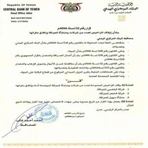 أصدر محافظ البنك المركزي اليمني، اليوم، أول قرارين عقابيين لعام 2026م، شمل القرار رقم (1) إيقاف تراخ...