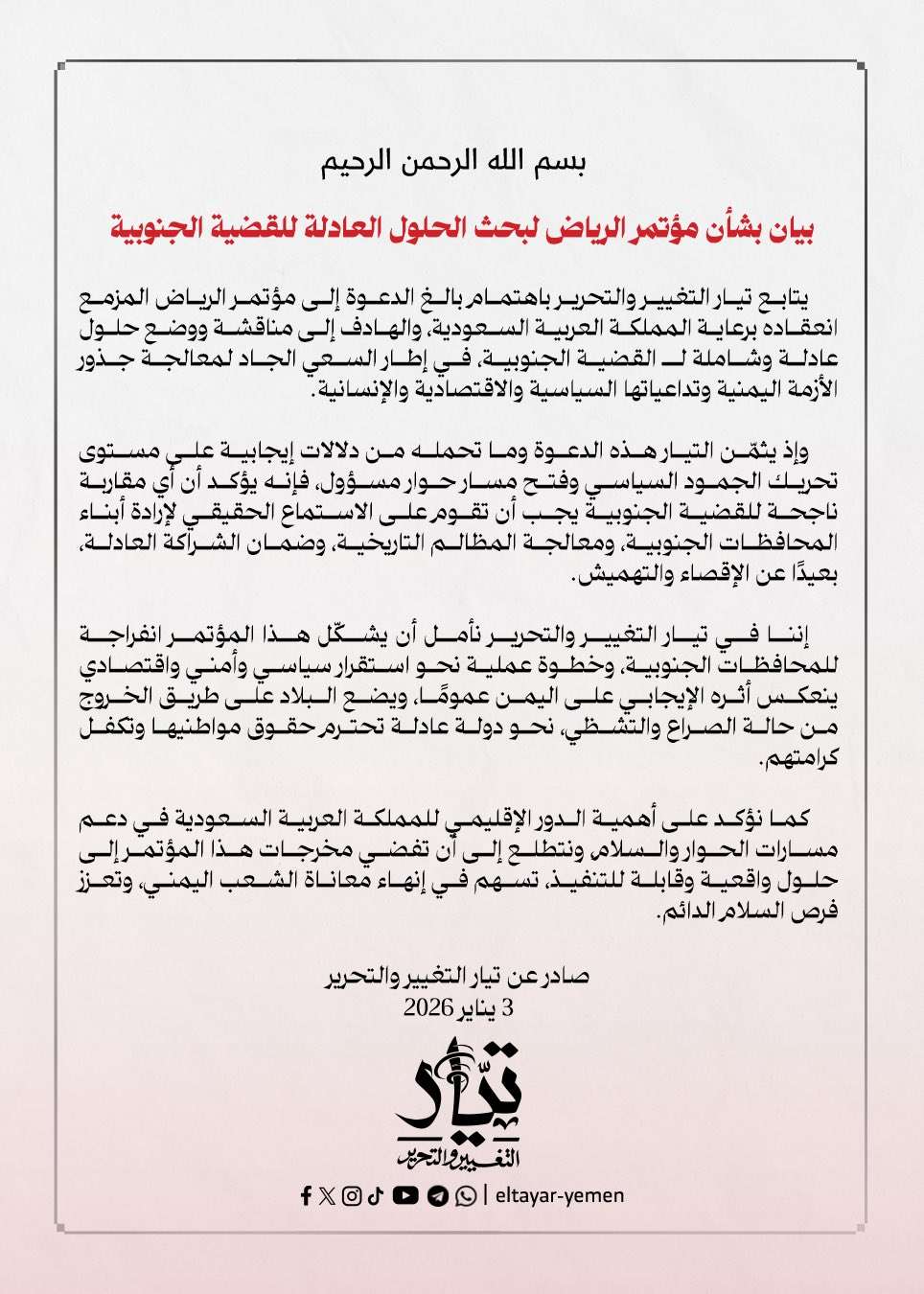 رحب تيار التغيير و التحرير بالدعوة التي وجهتها المملكة العربية السعودية إلى الأطراف الجنوبية لعقد مؤتمر حوار جنوبي ـ جنوبي في الرياض.