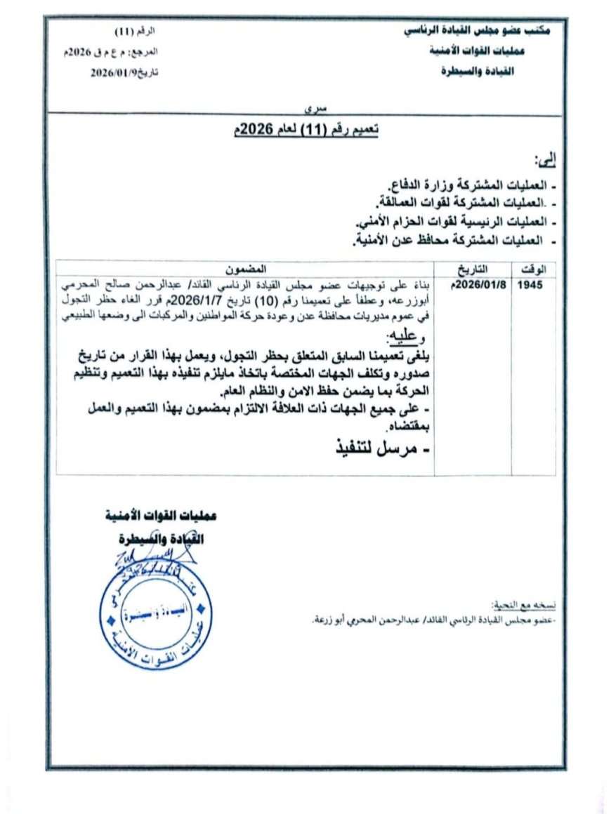 ​بناءً على توجيهات عضو مجلس القيادة الرئاسي، القائد عبد الرحمن صالح المحرّمي، تقرر إلغاء حظر التجوال في عموم مديريات العاصمة عدن، وعودة حركة المواطنين والمركبات إلى وضعها الطبيعي، ابتداءً من تاريخ صدور القرار.