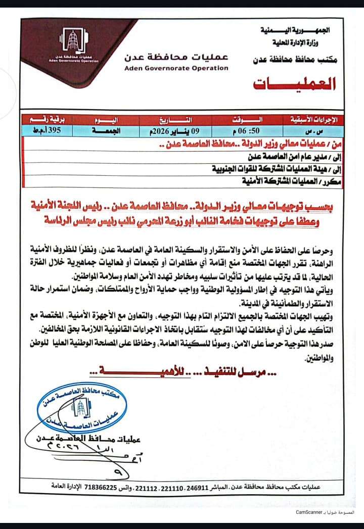 أصدرت عمليات محافظ العاصمة عدن برقية عاجلة (رقم 395 أ.م.ط) بتاريخ 9 يناير 2026، تضمنت توجيهات صارمة من وزير الدولة محافظ عدن، بناءً على تعليمات نائب رئيس مجلس القيادة الرئاسي "أبو زرعة المحرمي". ونصت التوجيهات على ما يلي: