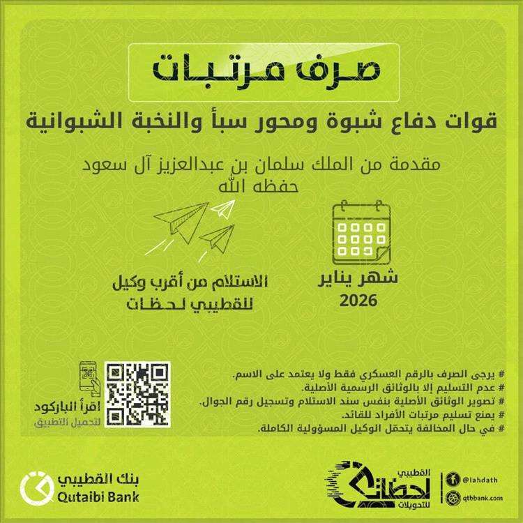 أعلن بنك القطيبي عن بدء صرف مرتبات قوات دفاع شبوة ومحور سبأ والنخبة الشبوانية، بمقدمة من الملك سلمان بن عبدالعزيز آل سعود، وذلك خلال شهر يناير 2026، في إطار الدعم المستمر لتعزيز الاستقرار المعيشي للقوات العسكرية والأمنية.