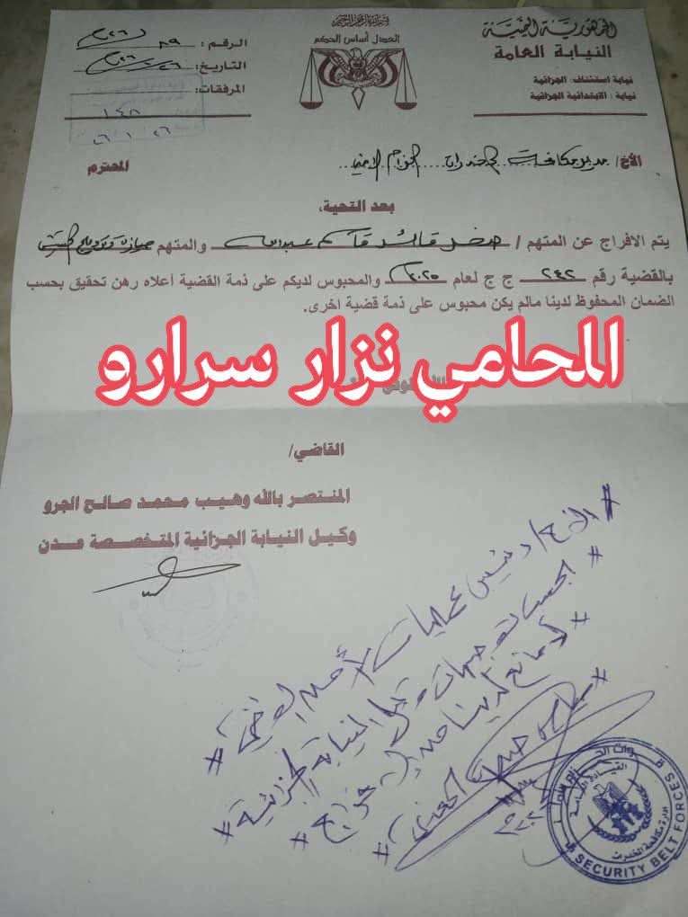 أعلن المحامي الحقوقي نزار سرارو، اليوم، عن نجاح الجهود القانونية والمدنية في انتزاع حرية أحد المعتقلين الذين احتجزوا "خارج إطار القانون" في سجون الحزام الأمني، وذلك بعد رحلة مريرة من الانتهاكات التي طالت المعتقل وأسرته.