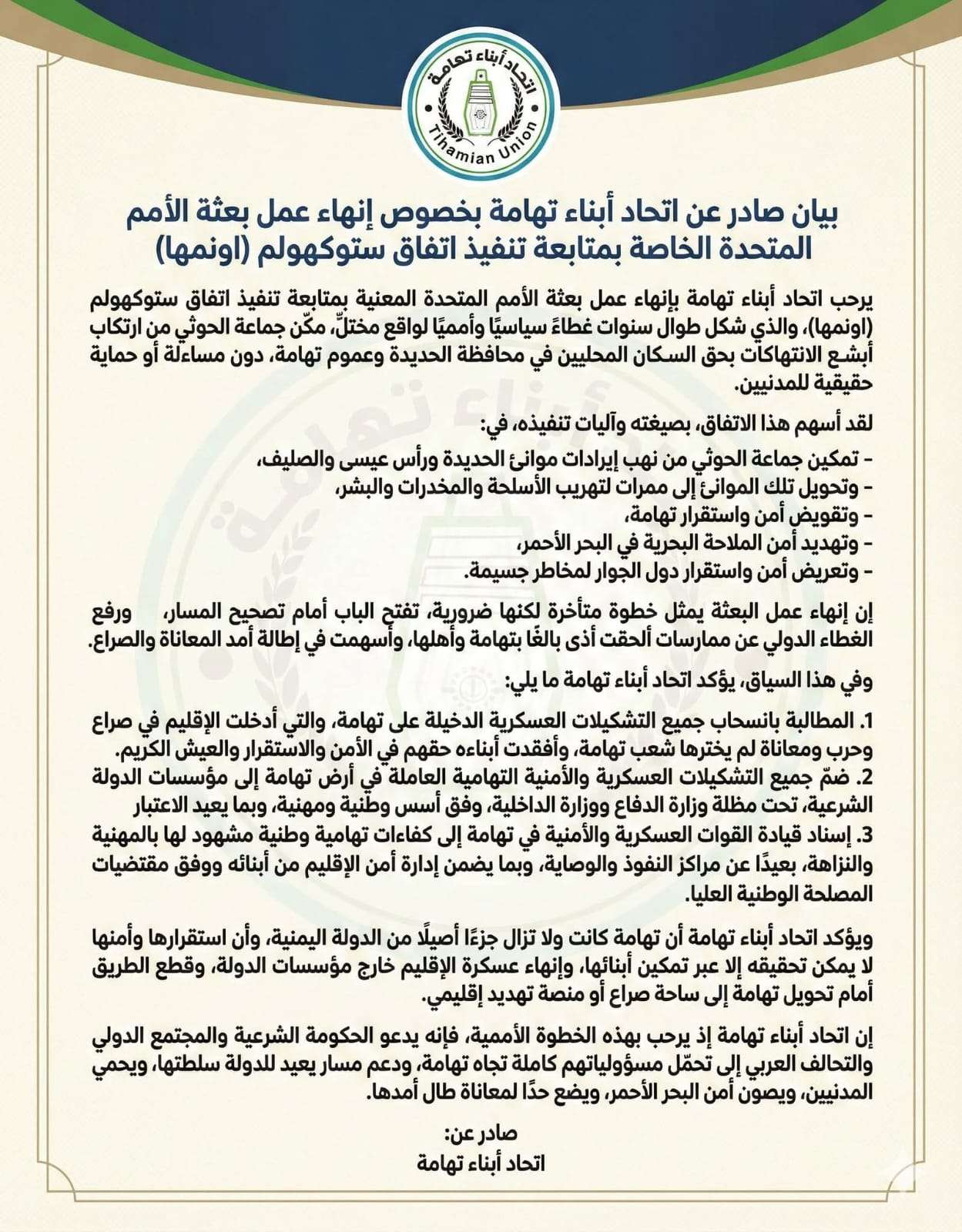 إن اتحاد أبناء تهامة إذ يرحب بهذه الخطوة الأممية، فإنه يدعو الحكومة الشرعية والمجتمع الدولي والتحالف العربي إلى تحمّل مسؤولياتهم كاملة تجاه تهامة، ودعم مسار يعيد للدولة سلطتها، ويحمي المدنيين، ويصون أمن البحر الأحمر، ويضع حدًا لمعاناة طال أمدها.