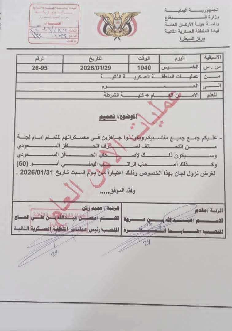 وفقاً لتعميم رسمي صادر عن مركز السيطرة وعمليات المنطقة العسكرية الثانية بتاريخ 29 يناير 2026، وجهت القيادة بجمع كافة المنتسبين وتجهيزهم للتمام أمام اللجنة المختصة من التحالف العربي لصرف الحافز السعودي. وأكد التعميم أن الصرف سيشمل أصحاب الرواتب اليمنية (أبو 60)، أسوة بزملائهم الحاصلين على الحافز مسبقاً، وذلك اعتباراً من يوم السبت الموافق 31 يناير 2026.