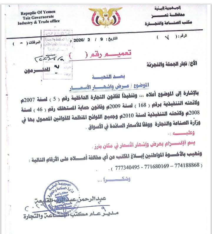 أصدر مكتب الصناعة والتجارة، اليوم الإثنين، التعميم رقم (7) لسنة 2026م، الموجه لجميع تجار الجملة والتجزئة في كافة الأنشطة التجارية، والذي يجدد الإلزام بوجوب عرض وإشهار أسعار السلع بصورة واضحة ومقروءة في أماكن بارزة داخل المنشآت.