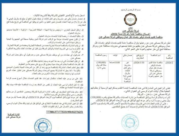 أعلنت شركة مصافي عدن عن إنزال مناقصة عامة رقم (2) للعام 2026م، والخاصة بتقديم خدمات توفير باصات لنقل عمال وموظفي الشركة.