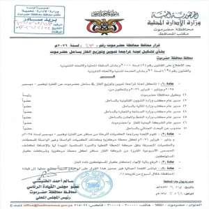 عضو مجلس القيادة محافظ حضرموت يصدر قرارا بتشكيل لجنة مراجعة تموين وتوزيع الغاز بساحل حضرموت