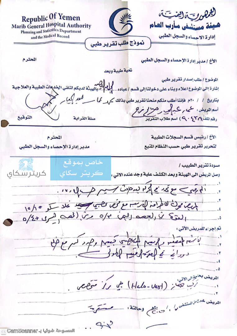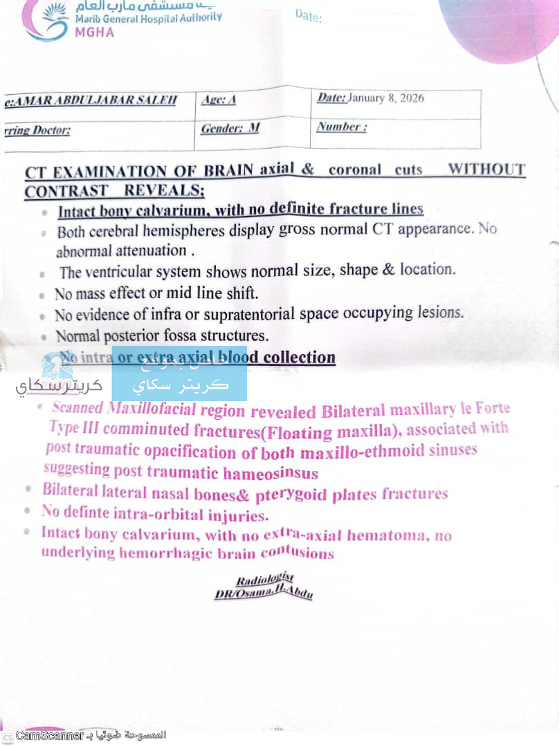 ​الجندي محمد عمار، البالغ من العمر 22 عاماً، تعرض قبل ثلاثة أشهر لإصابة بالغة أثناء أداء واجبه في محافظة حضرموت، نُقل على إثرها إلى هيئة مستشفى مأرب العام. وتكشف التقارير الطبية المرفقة عن حجم الضرر الذي لحق بجسده النحيل، حيث يعاني من: