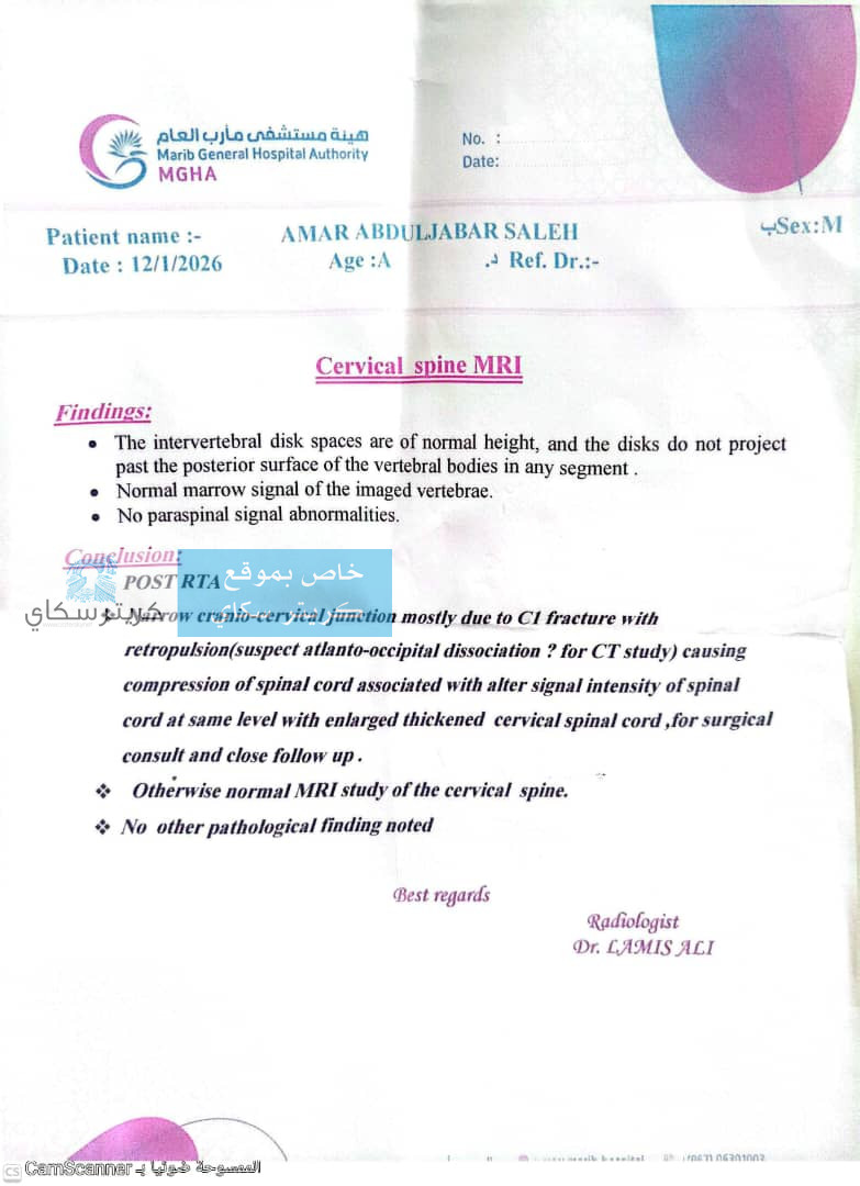 ​كسر في الفقرة العنقية الأولى (C1) مع ضغط شديد على النخاع الشوكي وتغير في إشارته.