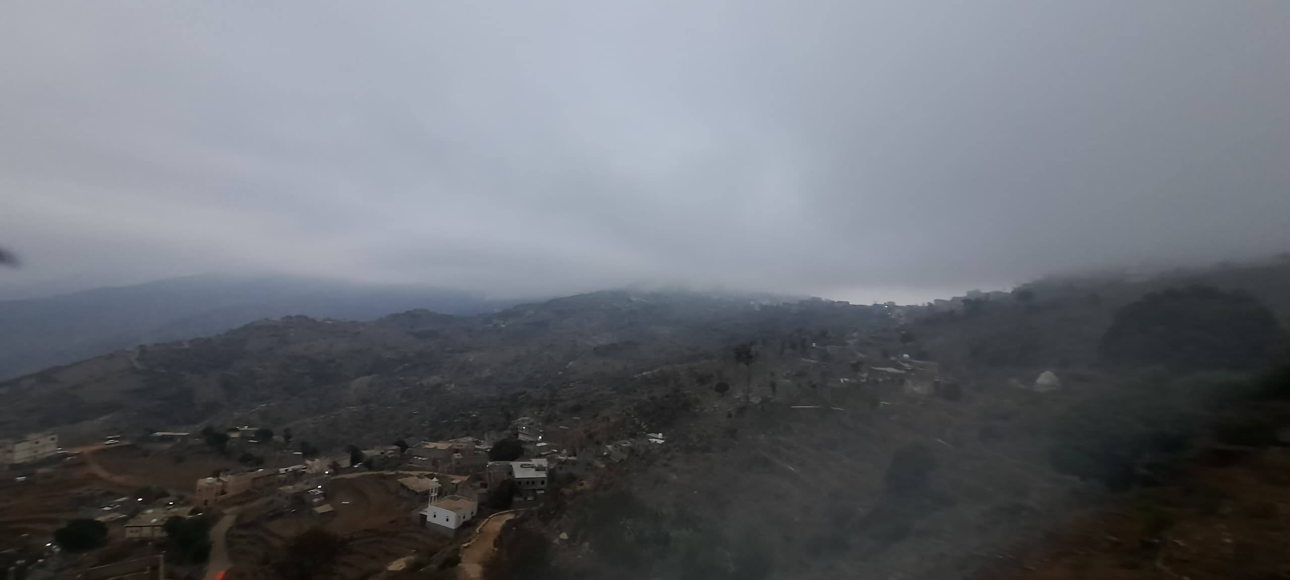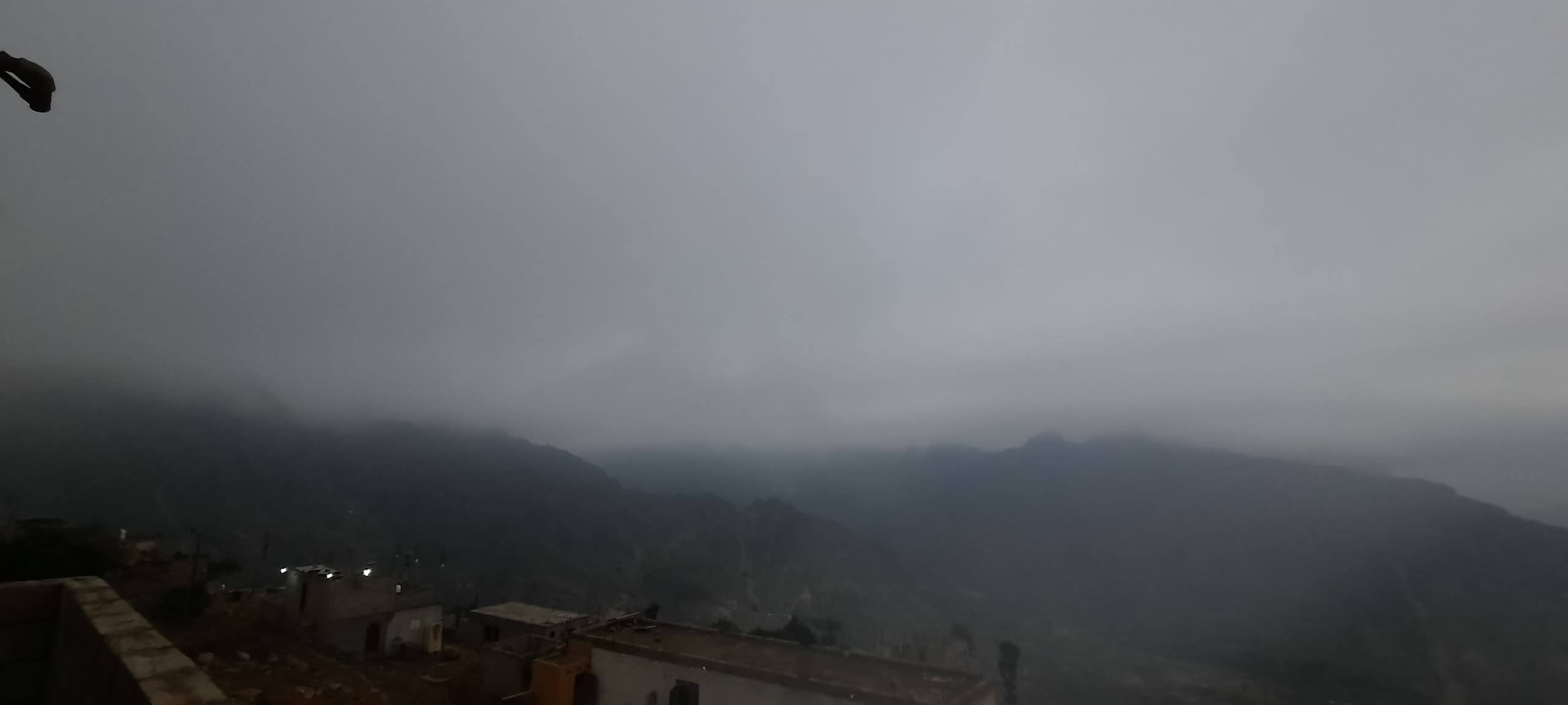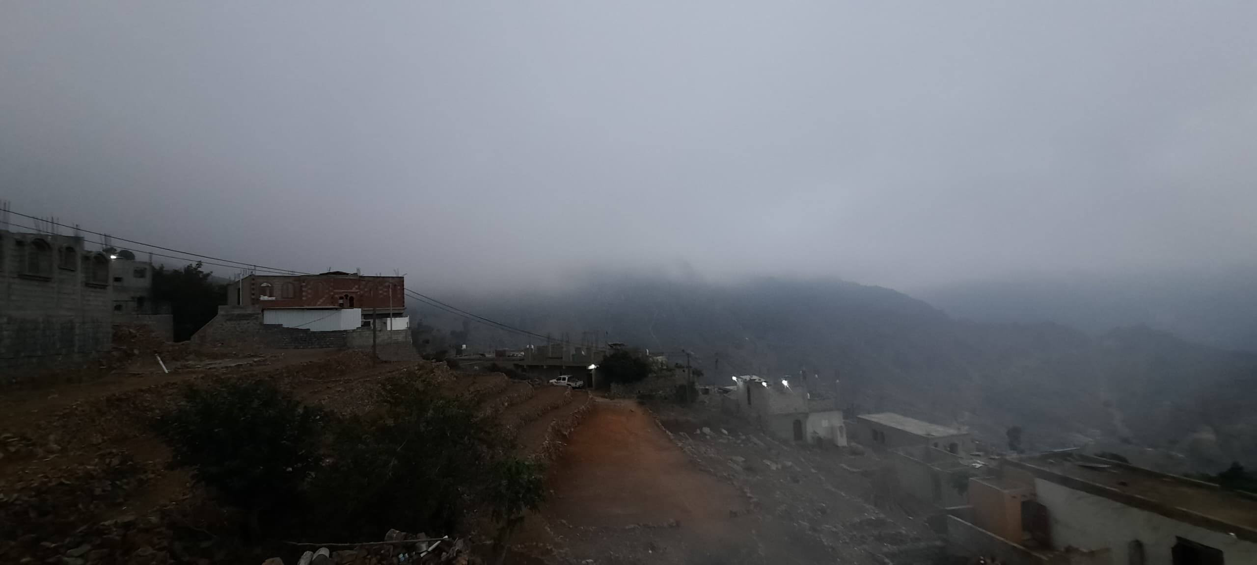 وأفاد سكان محليون بأن الضباب الكثيف غطى المنازل والمدرجات الزراعية بالكامل، مما أدى إلى انخفاض حاد في مدى الرؤية الأفقية ورسم لوحة جمالية غاية في الروعة تداخلت فيها السحب مع قمم الجبال.