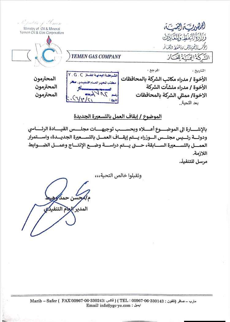 أعلنت الشركة اليمنية للغاز، إيقاف العمل بالتسعيرة الجديدة لأسطوانات الغاز، وذلك بناءً على توجيهات صادرة عن القيادة الرئاسية والحكومة، وفق مذكرة رسمية متداولة.