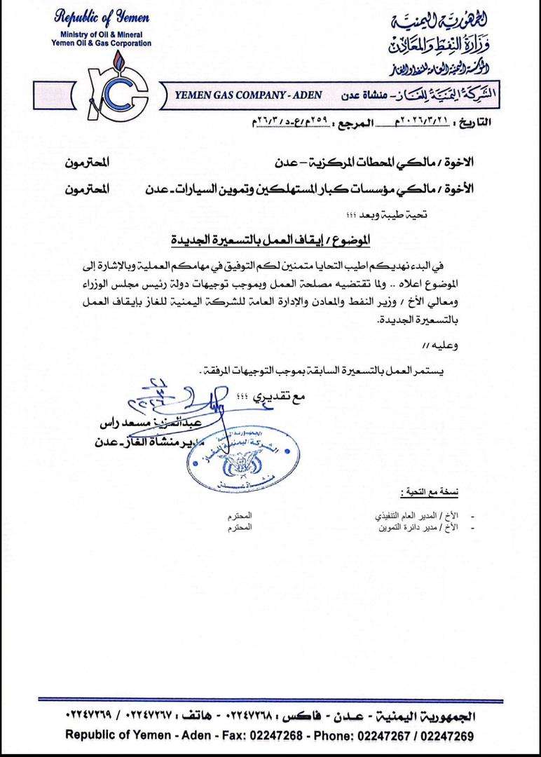 أصدرت منشأة الغاز – عدن، التابعة للشركة اليمنية للغاز، تعميماً رسمياً يقضي بإيقاف العمل بالتسعيرة الجديدة لأسطوانات الغاز، والاستمرار بالتسعيرة السابقة، وذلك استجابةً لمتطلبات المصلحة العامة وتوجيهات القيادة العليا.