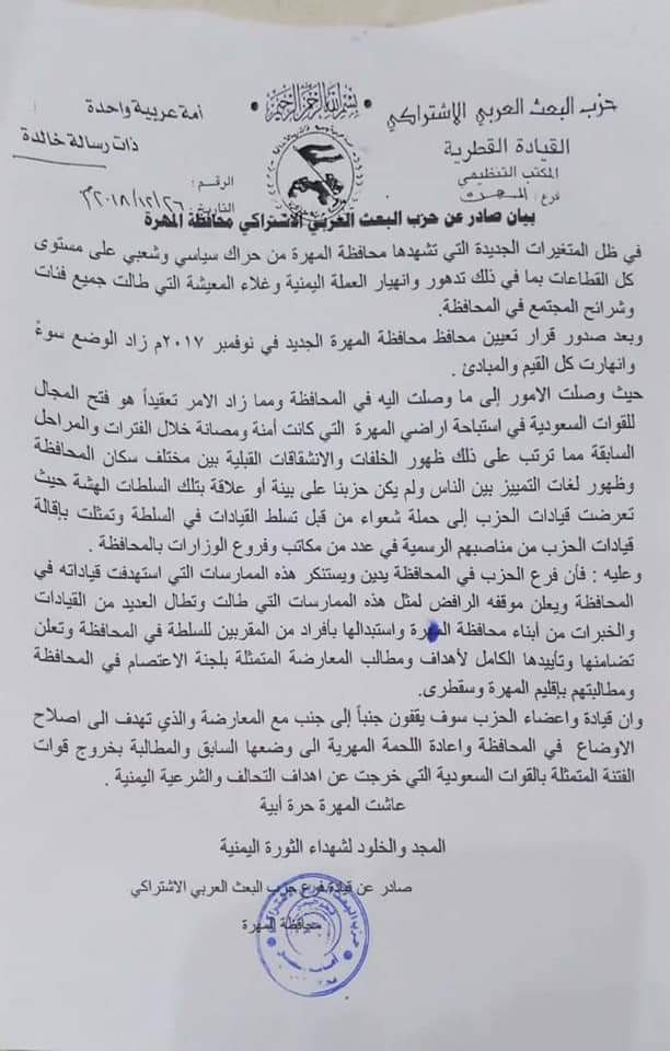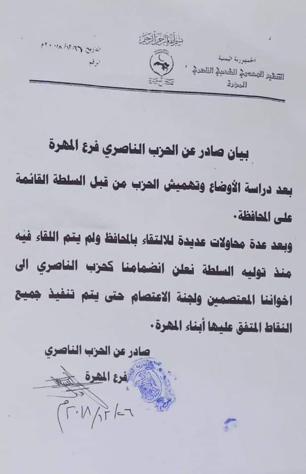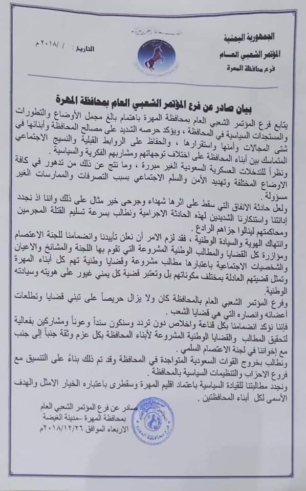 ويطالب المعتصمين بمغادرة القوات السعودية من المحافظة التي قالوا انها تنتهك السيادة الوطنية.