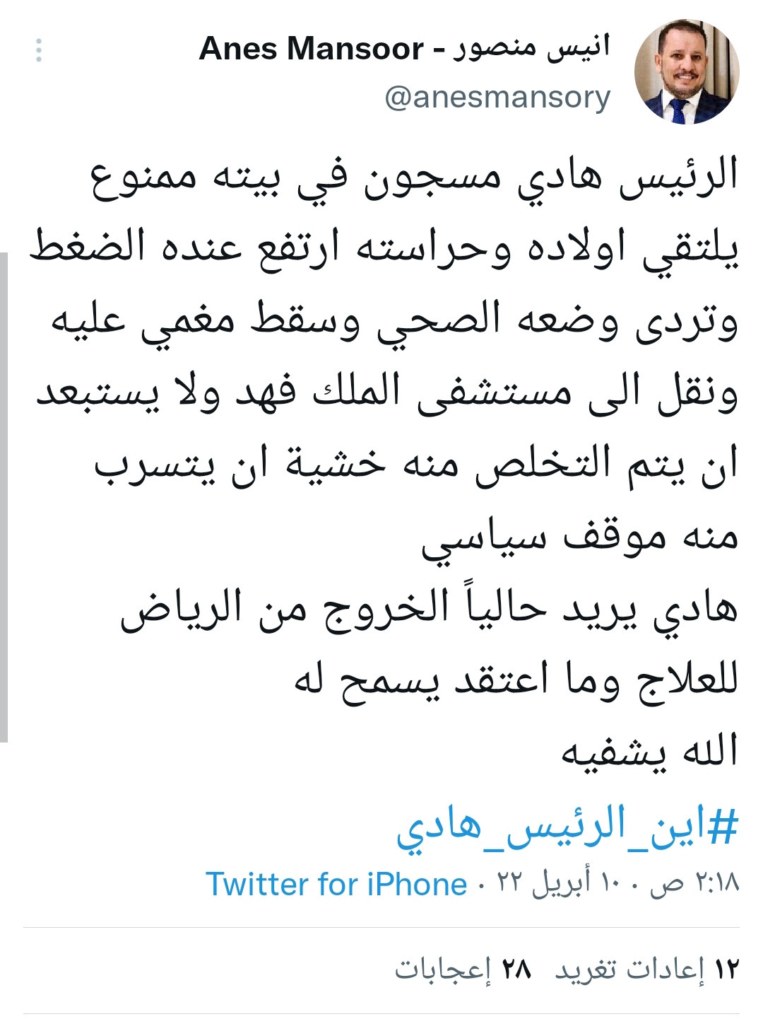 اوضح الصحفي أنيس منصور عن تدهور الحالة الصحية للرئيس السابق عبدربه منصور هادي و نقله إلى مستشفى الملك فهد