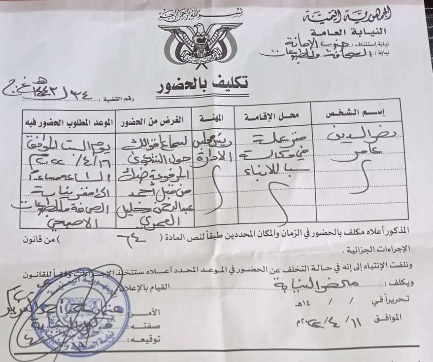 تحدث رئيس مجلس إدارة وكالة الأنباء اليمنية سبأ التابعة لجماعة الحوثي نصر الدين عامر عن رفع مدير مكتب قناة المنار ومدير مكتب قناة الميادين برفع قضية ضده.