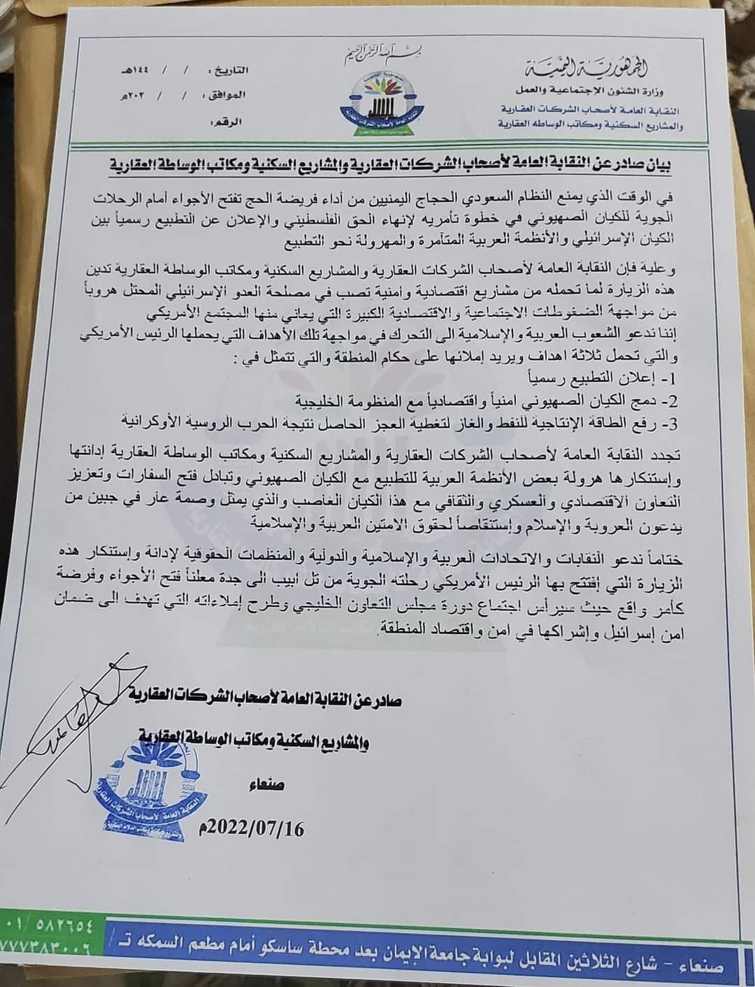 اصدرت النقابة العامة لأصحاب الشركات العقارية والمشاريع السكنية ومكاتب الوساطة العقارية بالعاصمة صنعاء بياناً جديداً
