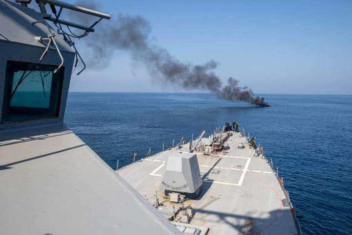 أعلنت البحرية الإمريكية إنقاذ ثلاثة مواطنين يمنيين اندلع حريق بقاربهم وسط البحر.