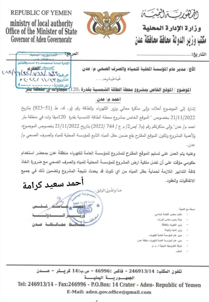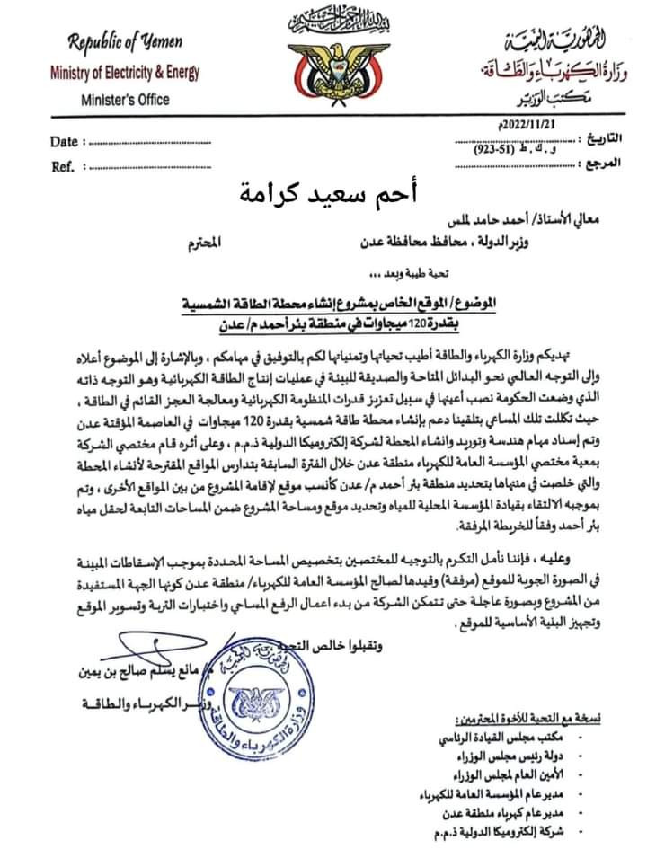 كشف الصحفي أحمد سعيد كرامة عن انشاء محطة كهربائية بالطاقة الشمسية بمدينة عدن.