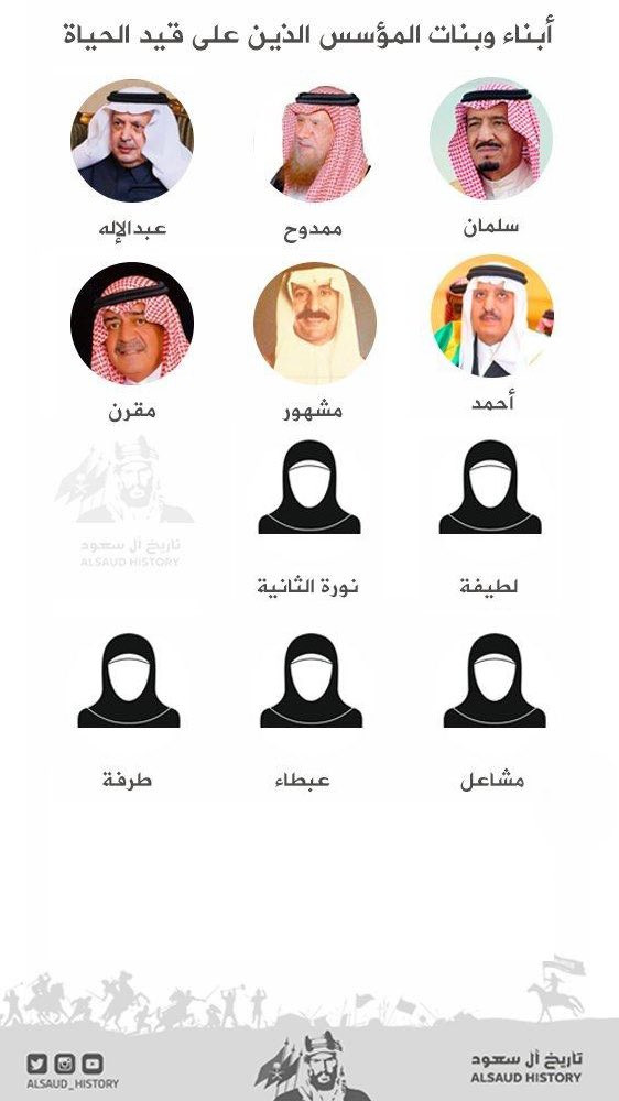كشف حساب "تاريخ آل سعود" في تغريدة على موقع "تويتر" أسماء أبناء وبنات الملك الراحل عبد العزيز آل سعود الذين على قيد الحياة، حسب الترتيب العمري.