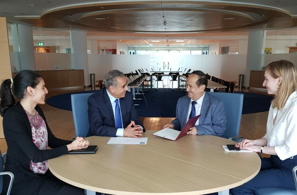 سلم مدير المعهد الدولي للسلام في الشرق الأوسط وشمال افريقيا الدكتور نجيب فريجي اليوم سفير اليمن في البحرين الدكتور علي حسن الاحمدي دعوة لفخامة الرئيس عبدربه منصور هادي رئيس الجمهورية لحضور المنتدى العالمي لثقافة السلام التي ينظمها المعهد بالاشتراك مه مؤسسة عبدالعزيز البابطين في 13 يونيو 2019م في هولندا.