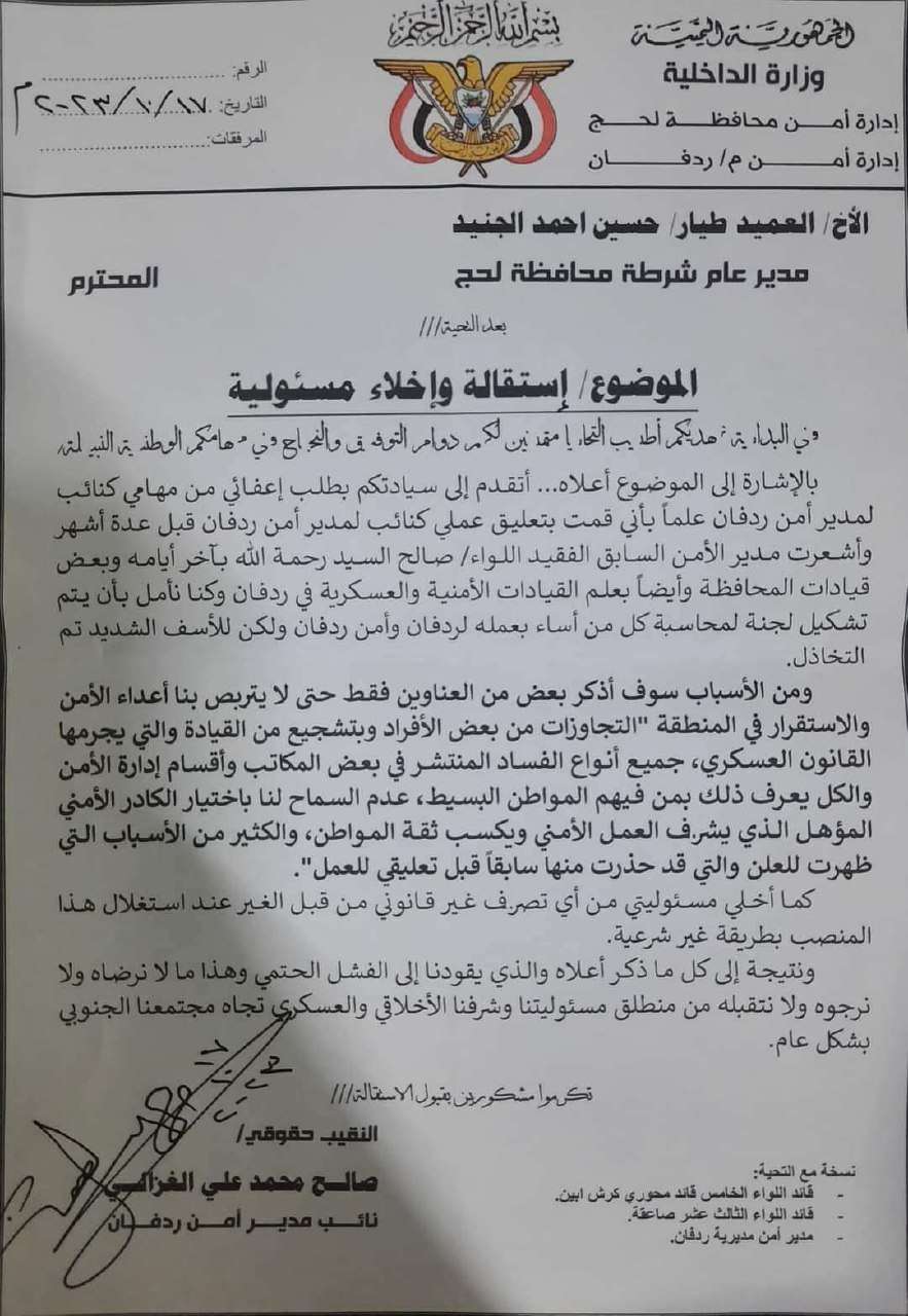 وفي البداية هديكم أطيب التحار يا متهد بين لكم دوام التوف في والنجاح في هامكم الوطنية النبي لمنه بالإشارة إلى الموضوع أعلاه... أتقدم إلى سيادتكم بطلب إعفائي من مهامي كنائب لمدير أمن ردفان علماً بأني قمت بتعليق عملي كنائب لمدير أمن ردفان قبل عدة أشهر وأشعرت مدير الأمن السابق الفقيد اللواء/ صالح السيد رحمة الله بآخر أيامه وبعض قيادات المحافظة وأيضاً بعلم القيادات الأمنية والعسكرية في ردفان وكنا نأمل بأن يتم تشكيل لجنة لمحاسبة كل من أساء بعمله لردفان وأمن ردفان ولكن للأسف الشديد تم التخاذل.