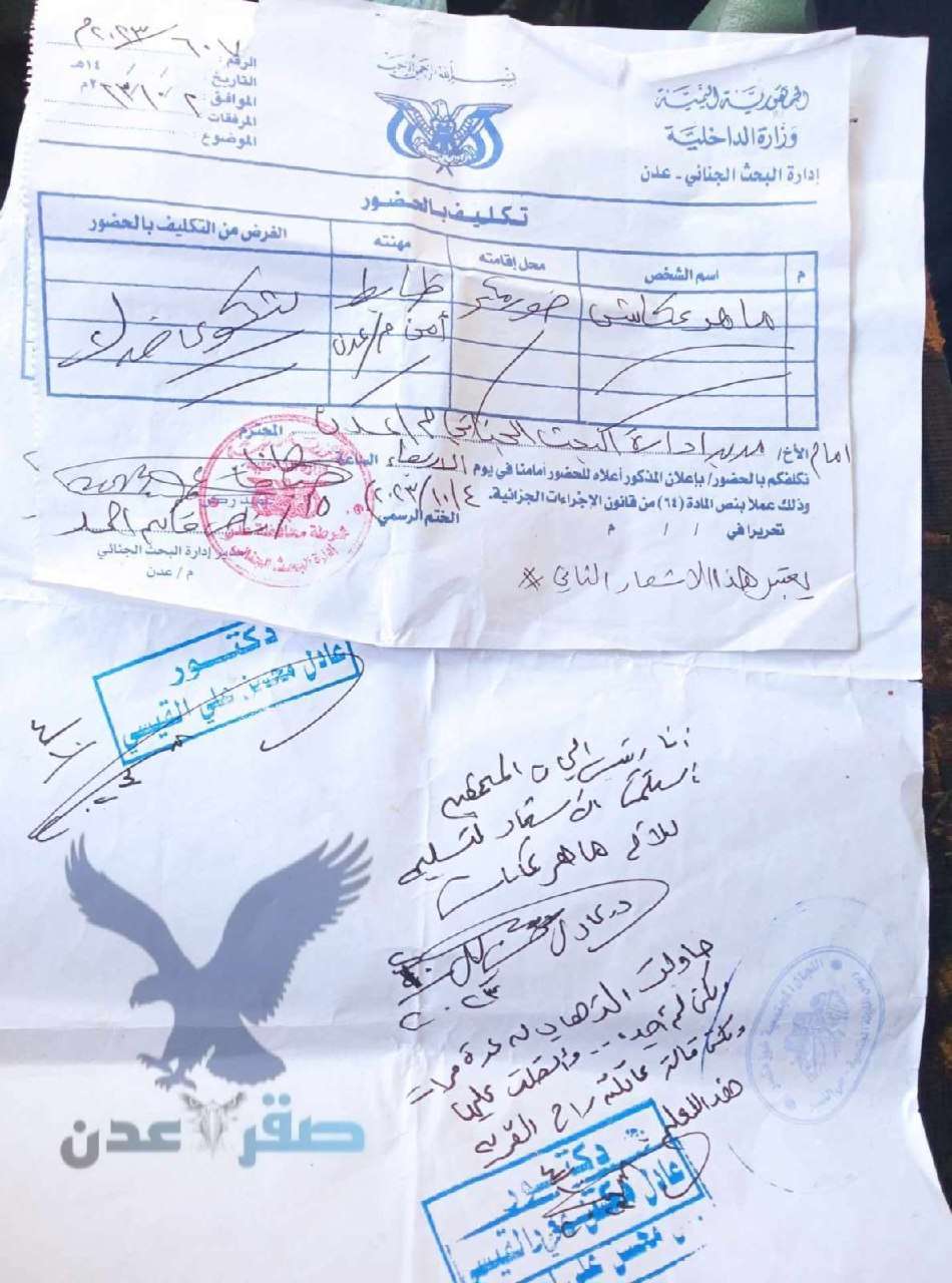 أصدرت النيابة العامة امر استدعاء بحق مسئول امني بعدن غادرها قبل أسابيع الى محافظة أخرى .
