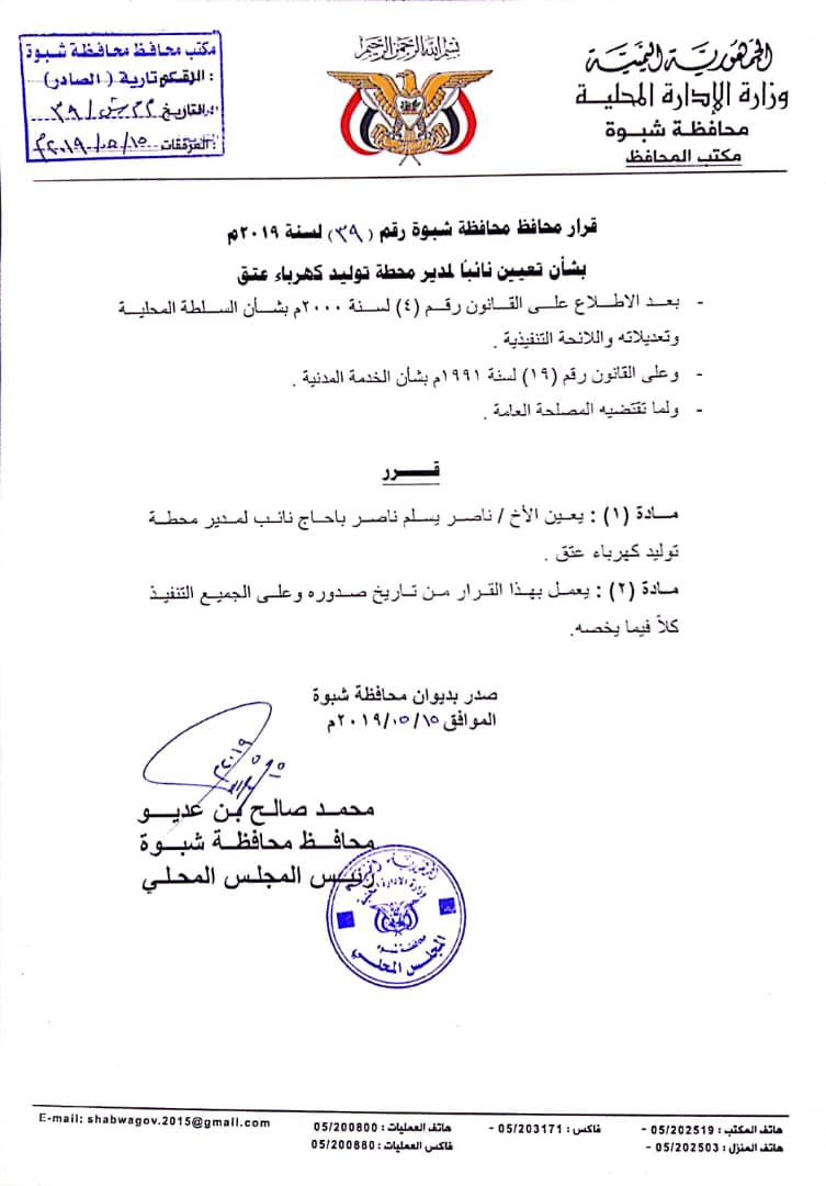 اصدر محافظ شبوة قرارا بشأن المواطن الذي انقذ مؤسسة الكهرباء بعد فشل المهندسين في ربط الميجا واط الجديدة بالمحطة الرئيسية.