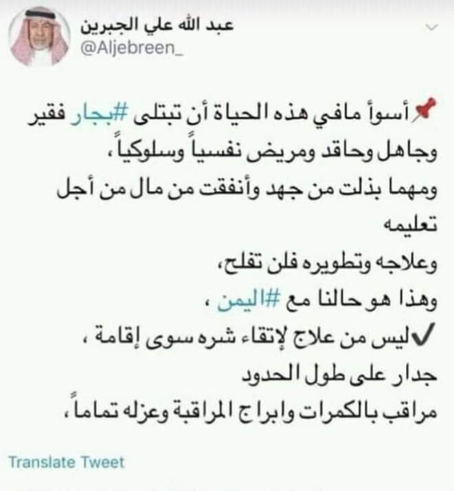 وكان الاديب والشاعر عبدالله علي الجبرين قال بوقت سابق :أسوأ مافي هذه الحياة أن تبتلى #بجار فقير وجاهل وحاقد ومريض نفسياً وسلوكياً، ومهما بذلت من جهد وأنفقت من مال من أجل تعليمه وعلاجه وتطويره فلن تفلح، وهذا هو حالنا مع #اليمن ،ليس من علاج لإتقاء شره سوى إقامة ، جدار على طول الحدود مراقب بالكمرات وابراج المراقبة وعزله تماماً.