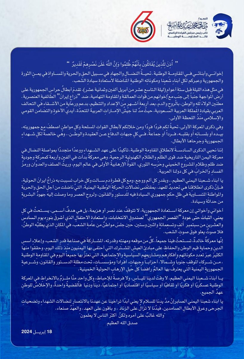 إننا نحيي الذكرى السادسةَ لانطلاقِ المقاومةِ الوطنية، تأكيدًا على عهد الشهداءِ ووعدًا متجددًا بمواصلةِ النضال في معركة اليمن التاريخيةِ ضد قوى الظلمِ والظلام الكهنوتيةِ الرجعية، وهي معركةٌ بدأت في ألفين وأربعة كمعركةٍ وجودية ضد ظلمِ وظلامِ المشروع الخميني وحرسِه الثوري، القوةِ الإرهابيةِ الأولى في عالم اليوم، وريثِ الصلف والعدوان ورمزِ الفسادِ والخرابِ في كل دولنا العربية.