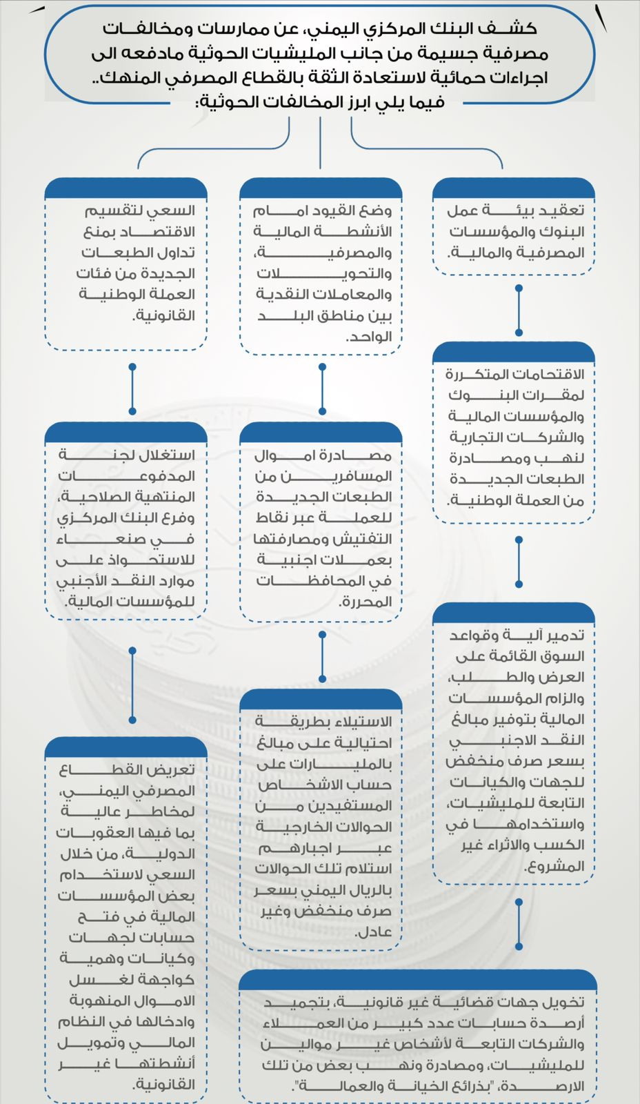 وحسب البنك المركزي فإن الممارسات التعسفية الحوثية، شملت تعقيد بيئة عمل البنوك، والمؤسسات المالية المنتشرة في مختلف مناطق الجمهورية، وتقييد الأنشطة المصرفية، من خلال السعي لتقسيم الاقتصاد ومنع تداول الطبعات الجديدة من فئات العملة الوطنية القانونية، واعاقة الحركة النقدية والمعاملات المالية بين المناطق المختلفة داخل البلد الواحد.
