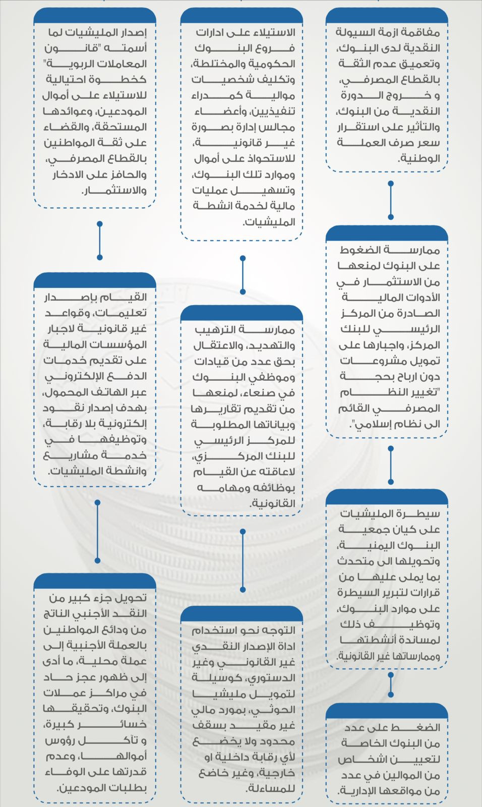 وتحدث البنك المركزي في هذا السياق عن اشكال عدة من ممارسات المليشيات، واساليبها الرامية للاستيلاء على مقدرات البنوك والمؤسسات المالية، وتسخيرها لخدمة أنشطتها وحروبها العبثية، والاضرار بالوضع الاقتصادي والمالي لليمن بشكل عام.