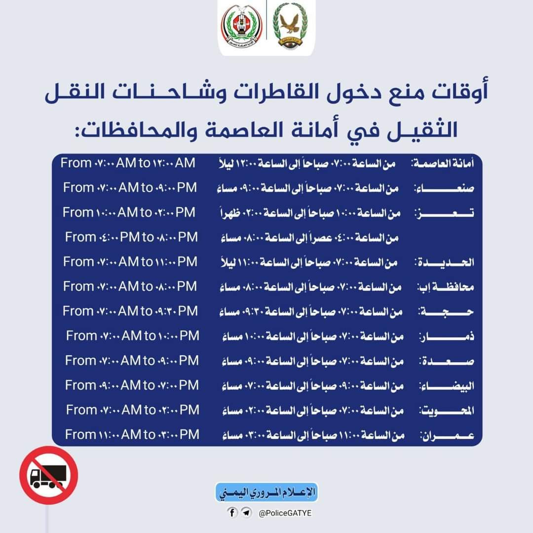 وجاءت مواعيد منع دخول القاطرات وشاحنات النقل الثقيل في الأوقات التالية: