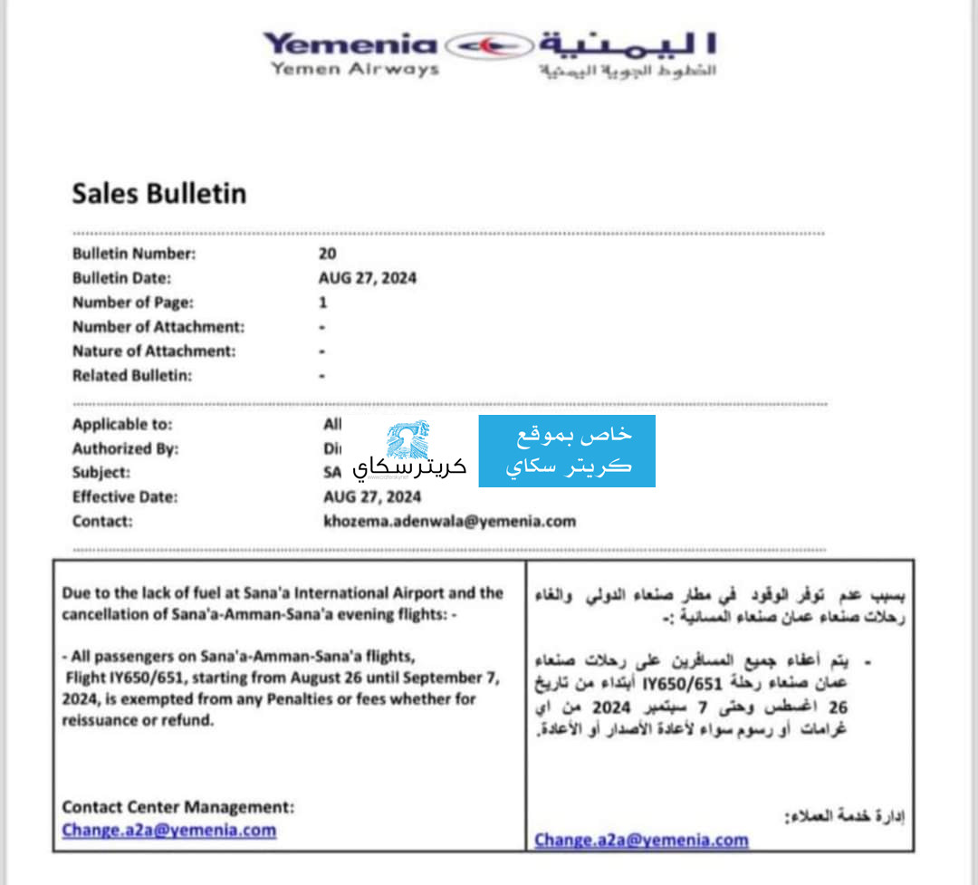 وحصل محرر موقع كريتر سكاي على توضيح شركة طيران اليمنية والذي جاء فيه: