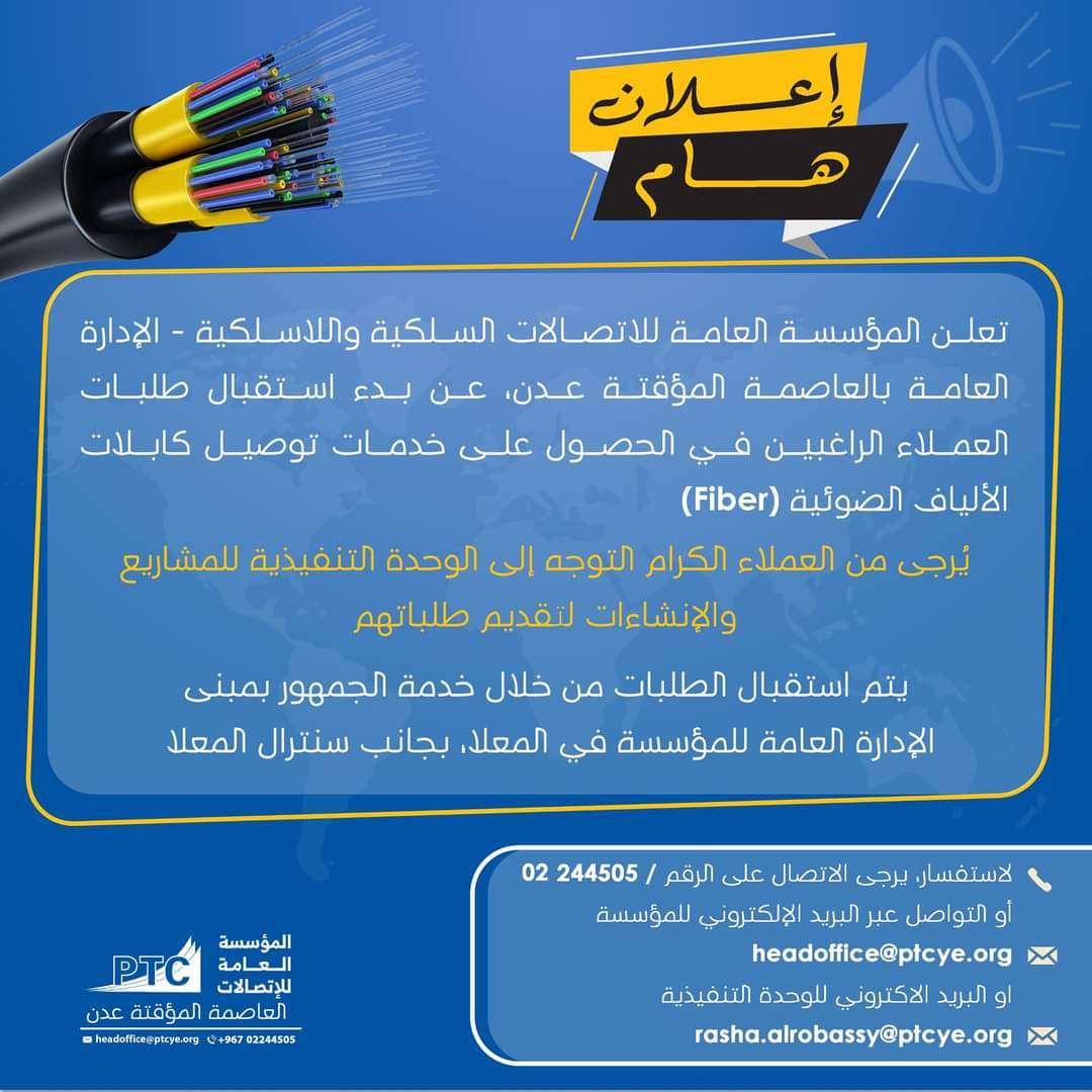اعلنت الموسسة العامة للاتصالات بعدن عن بدء استقبال طلبات الحصول على توصيل كابلات الالياف الضوئية فايبر.