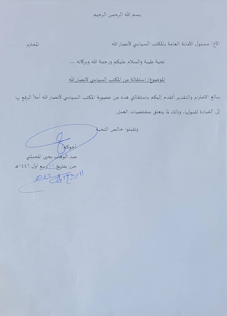 وحصل محرر موقع كريتر سكاي على وثيقة استقالة القاضي عبدالوهاب المحبشي من المكتب السياسي التابع لحكومة مليشيا الحوثي الغير معترف بها دوليا
